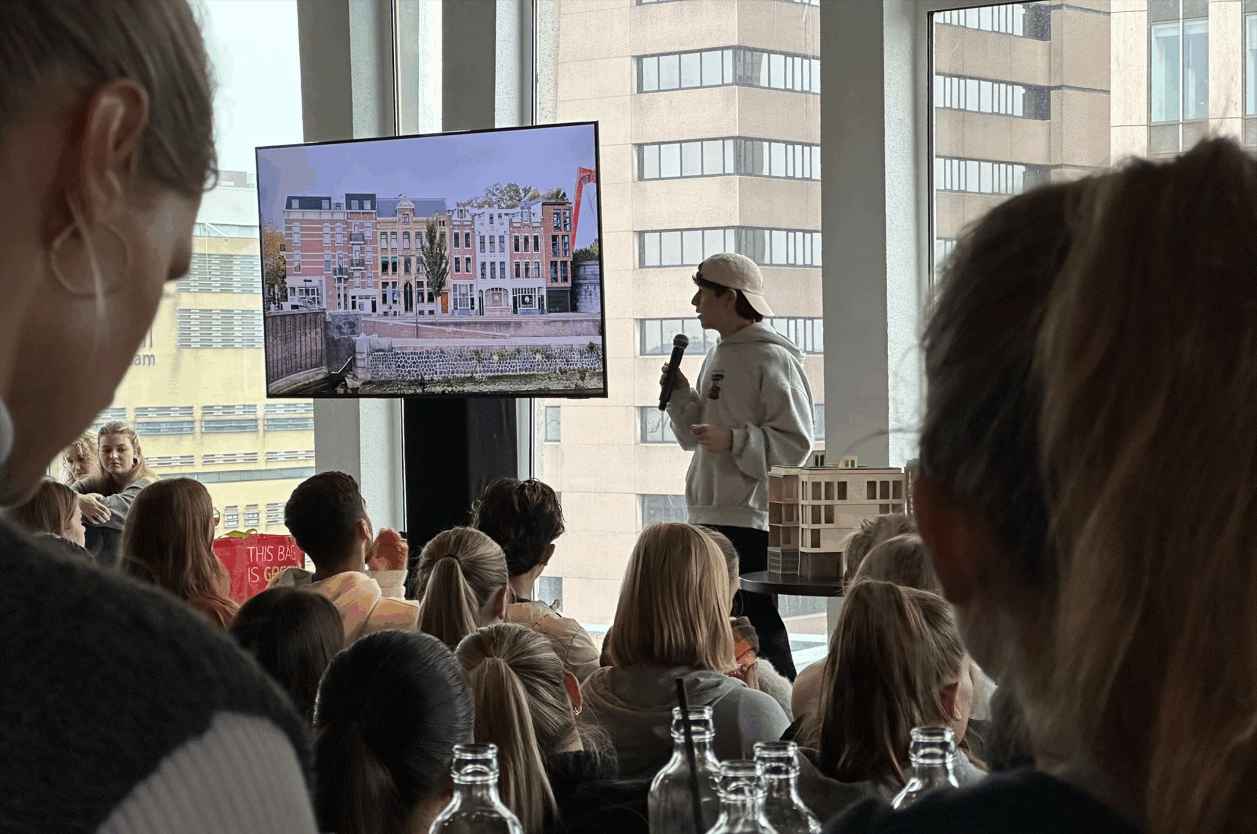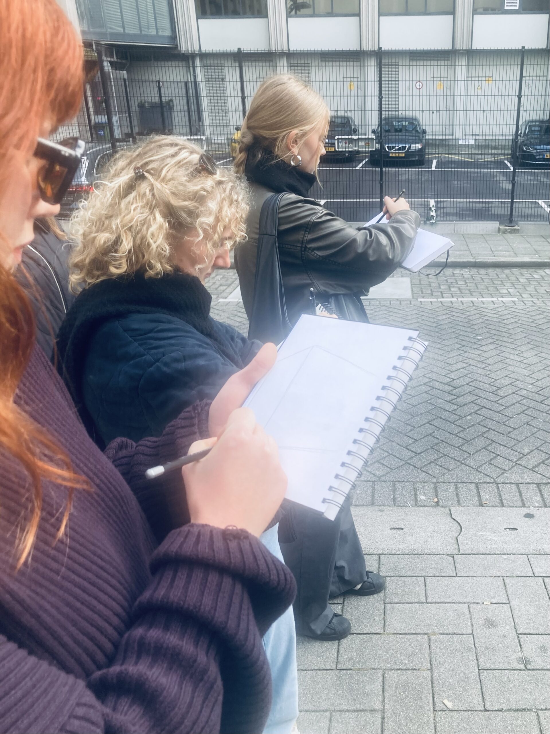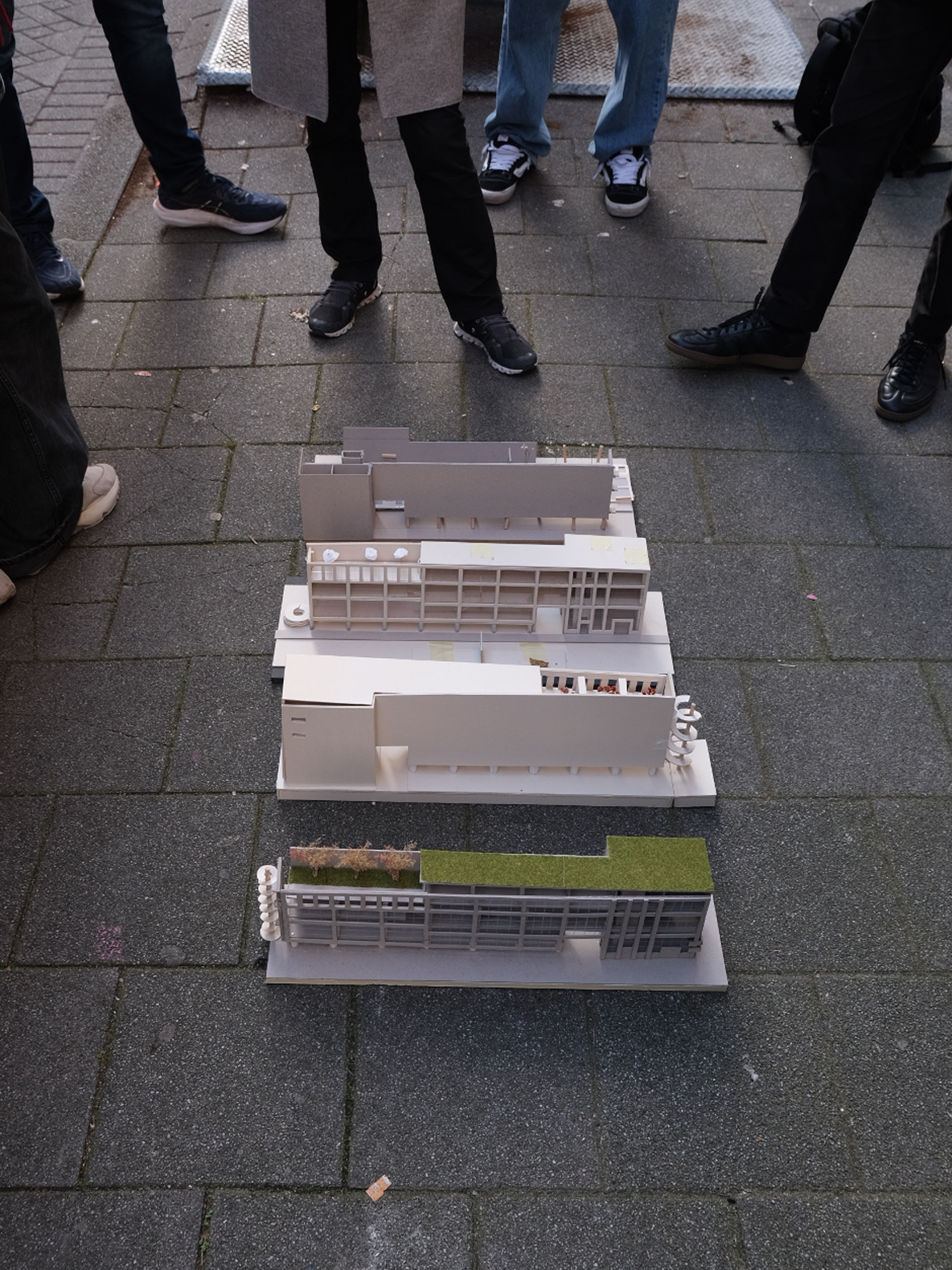 Am nächsten Tag führten die Studierenden ihre Lehrenden durch die Stadt zu den zuvor im Rahmen ihrer Analyseprojekte untersuchten Baulücken Rotterdams. Bereits im Vorfeld hatten sie Modelle angefertigt, die vor Ort zur besseren Verständlichkeit der städtebaulichen Situationen dienten. Dabei kam es mitunter zu spannenden Begegnungen und Gesprächen mit den Eigentümerinnen und Eigentümern der Gebäude, die wertvolle Einblicke in den alltäglichen Umgang mit Architektur und Stadtraum ermöglichten.