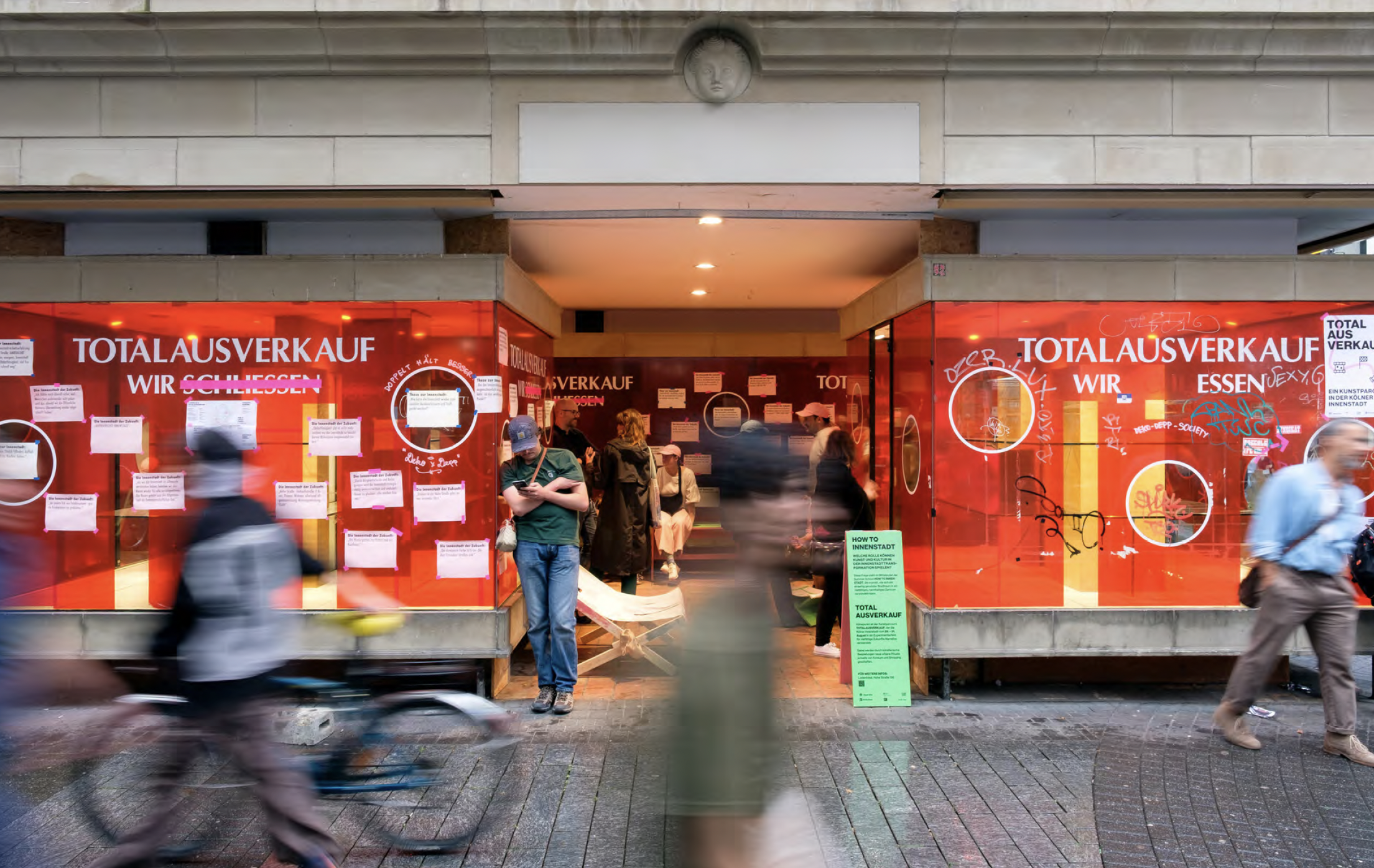 Dreh- und Angelpunkt des Projekts war die temporäre räumlich-experimentelle Transformation eines Leerstandes an der Hohe Straße im Sinne eines Reallabors. Beginnend mit studentischen Arbeiten an der Hochschule mündete das Projekt im Sommer 2025 in die Summer School HOW TO INNENSTADT sowie das mehrtägige Festival TOTALAUSVERKAUF, in dem in bestehenden Leerständen und dem öffentlichen Raum im Bereich Hohe Straße / Schildergasse unterschiedliche kulturelle und künstlerische Interventionen erlebbar wurden.