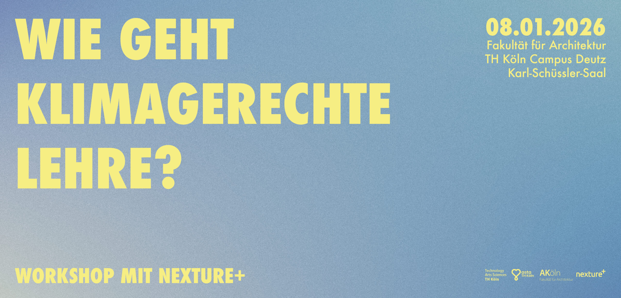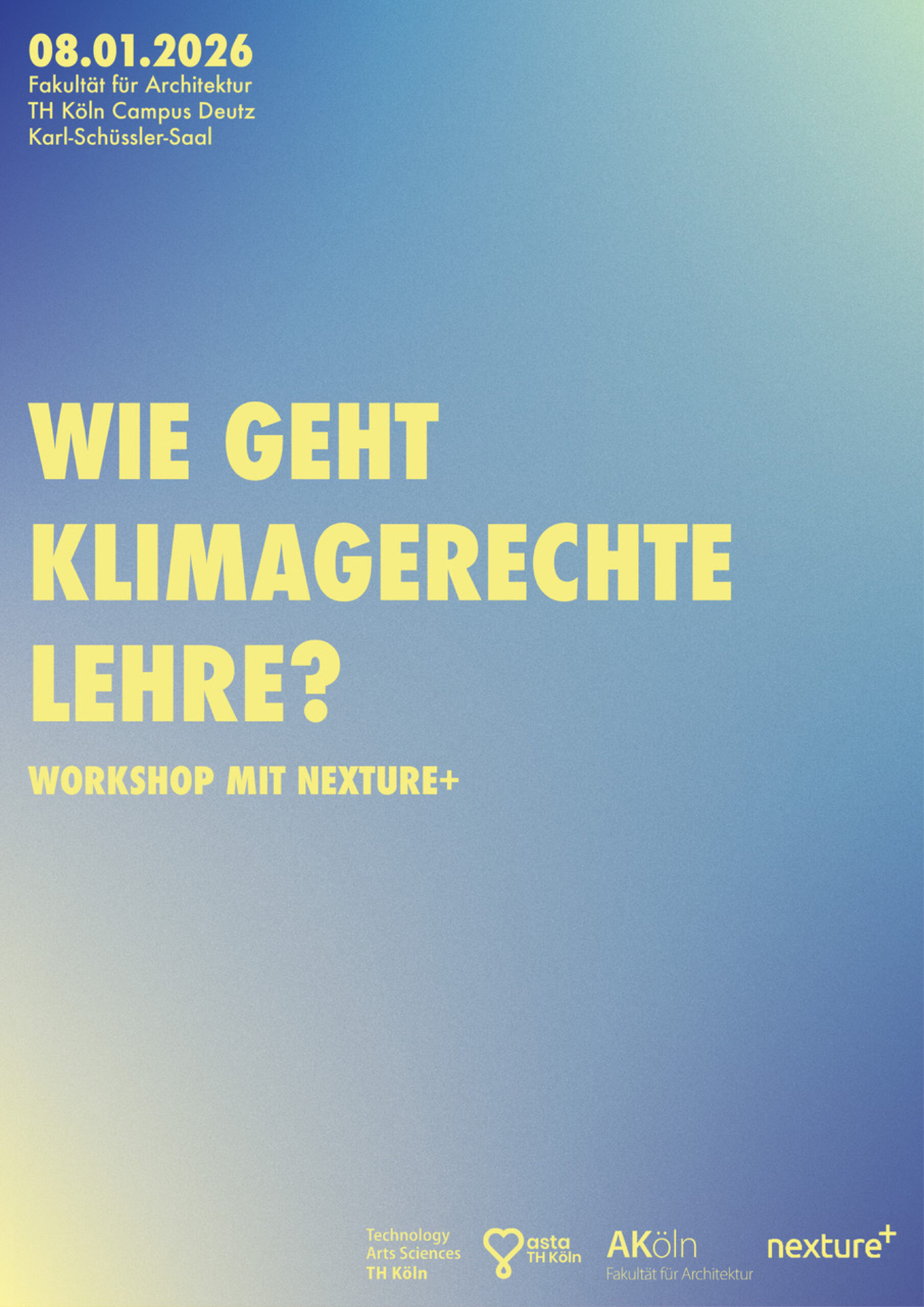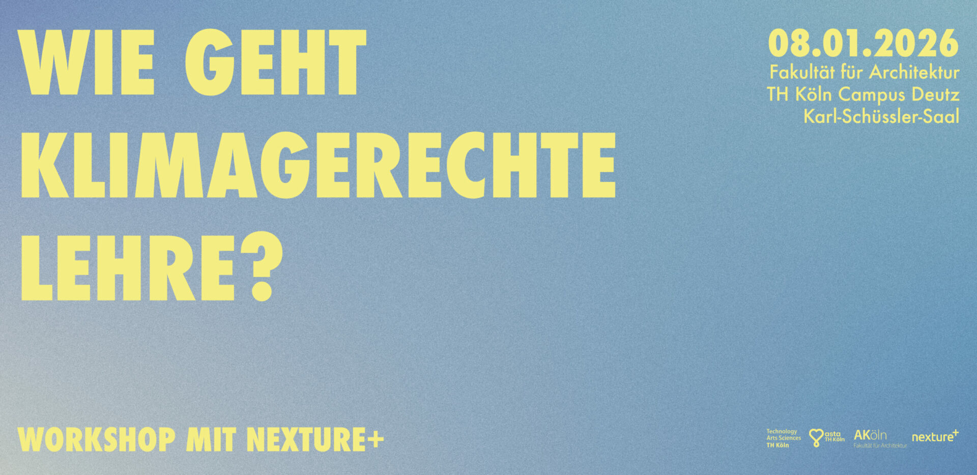 Gemeinsam mit nexture+ setzen wir uns mit der Bauwende in der Lehre auseinander. Im Rahmen eines Workshops stellen nexture+ ihren Handlungskatalog zur klimagerechten Lehre vor – und wir überlegen, was muss sich in unserem Studium ändern?